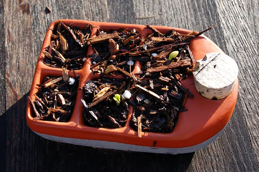 With space freed up in the small Orta Seed Pot, I dropped in some artichoke seeds off the plant I’ve been tending for ten years or so. Well, is it the same plant, or am I seeing new generations volunteer themselves? The internet claims artichoke plants live about six years. Anyway, I’ve never saved their seed, but was excited to see these little guys pop up in recent days.